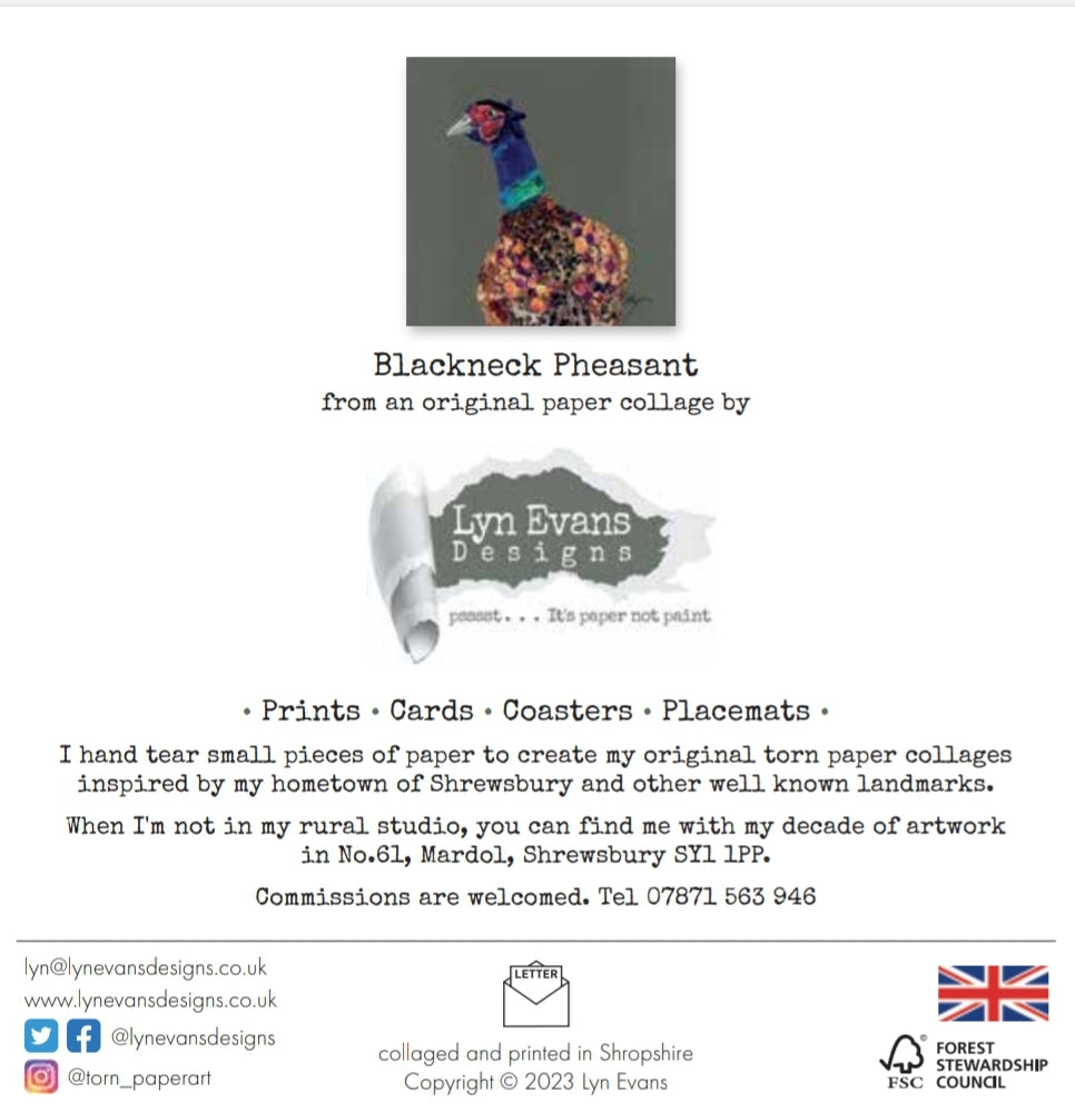 A blank greeting card of a Blackneck Pheasant taken from an original paper collage. This comes with a white envelope.