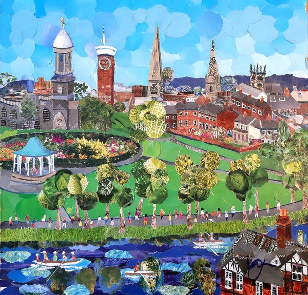 Taken from the original torn paper collage is a vibrant Shrewsbury Quarry Park available as a mini print.
