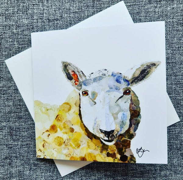 A blank greetings card of Stella the Sheep taken from an original paper collage. This comes with a white envelope.